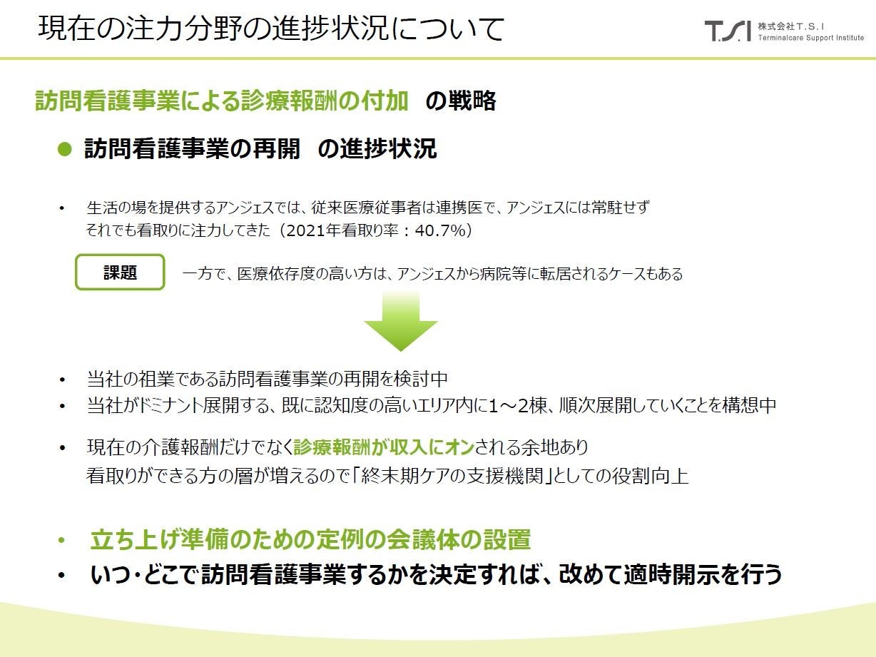 社名でもある「終末期ケアの支援機関」としての役割強化のため、ご自宅である当社のサービス付き高齢者向け住宅「アンジェス」でのお看取りを一層安心してさせていただくために、訪問看護事業再開に取り組んでいます。