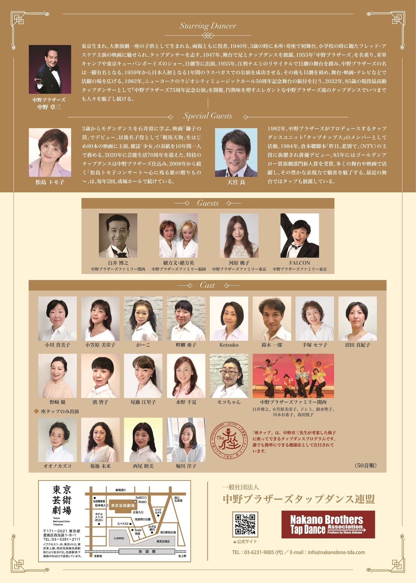 東京公演の特別ゲストには、歌手で女優の松島トモ子さんと俳優の天宮良さんをお招きします。お二人のタップダンスの師匠である中野章三とともに、古き良き昭和を思わせる華やかな演出で、ブロードウェイスタイルの本格的なシアタータップダンスをお届けします。また、45年前にリリースした音楽アルバムより、中野ブラザーズのオリジナル曲の歌唱とダンスも披露。舞台狭しと踊って歌う85歳の現役タップダンサーの勇姿を、ぜひ劇場でご覧ください。