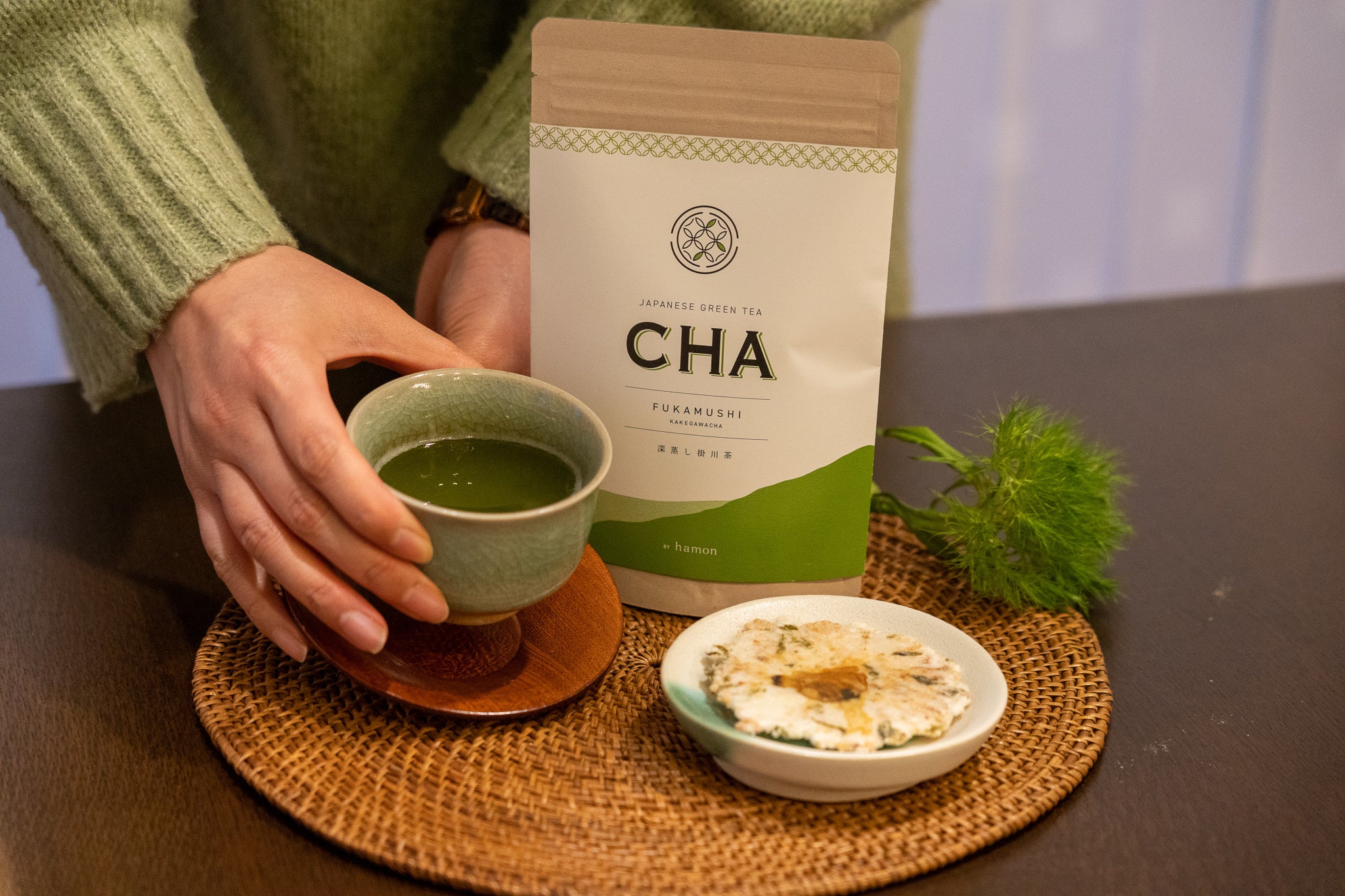 深蒸し茶は、名前の通り、普通煎茶よりも蒸し時間を2倍から3倍長くしています。陽射しをたっぷりと浴びた茶葉は、肉厚で豊富にカテキンを含んでいて、深く丁寧に蒸すことで、お茶本来の香りを生かしたままに、深い緑色と強い香りに加えて、濃厚な旨味と甘さが特徴です。深く蒸された茶葉は柔らかく、細かく、粉の多いお茶に仕上がるため、急須で淹れてお茶を飲む場合、お湯や水に溶けにくい茶の成分を多く含んだ粉が湯呑に注がれます。カテキン・テアニン・ビタミンE・ビタミンCはもちろん、食物繊維やミネラルなどの成分も多く飲むことができます。hamonのオリジナルシリーズ”CHA”の深蒸し茶は、色が濃く、細かい浮遊物がたくさん含まれているのが特徴で、この浮遊物には、普通のお茶にはほとんど含まれない成分が多く含まれています。