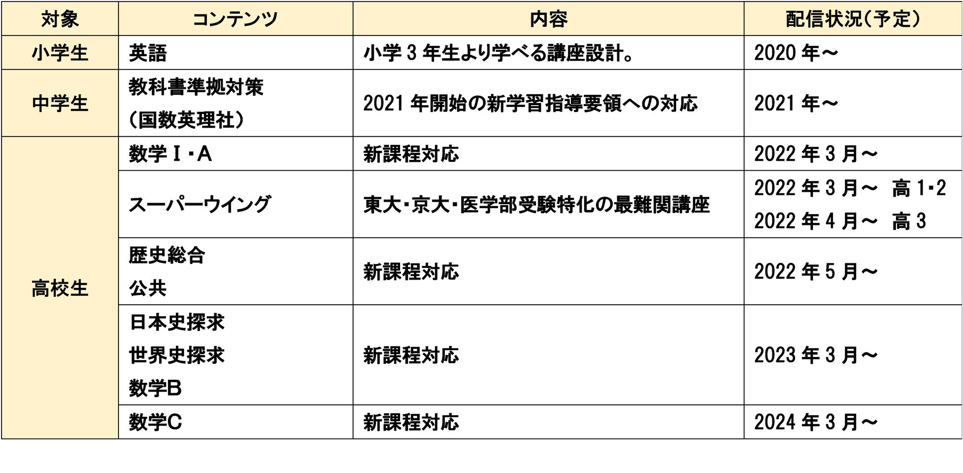 従来のウイングネットコンテンツ「ベーシックウイング」(教科書対応定期テスト対策・共通テスト対策・基礎力定着)、「アドバンスウイング」(国公立・有名私大対策)、「学研プライムゼミ」(難関国公立・私大対策)」の3つのコンテンツに加え、新たに東大・京大・医学部など最難関大学を目指す生徒を対象に、学びを広げる「スーパーウイング※1」を新たに作成。