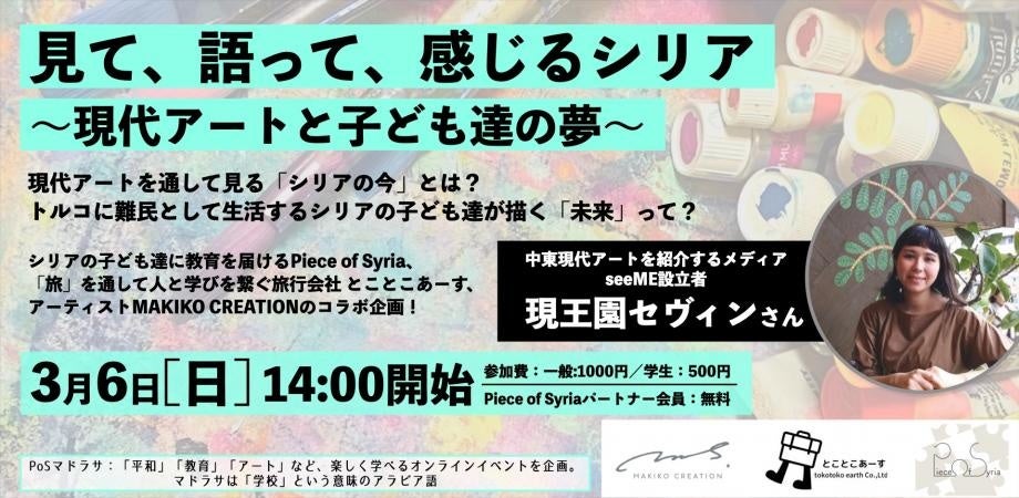 「シリアをまた行きたい国にする」をモットーに活動するNPO法人Piece of Syria(代表 中野貴行、以下「Piece of Syria」)は、2022年3月6日(日)に中東現代アートを紹介するメディアseeMEを設立者の現王園 セヴィンさんを招き、シリアのアートをテーマにしたイベント「見て、語って、感じるシリア〜現代アートと子ども達の夢〜」を実施いたします。