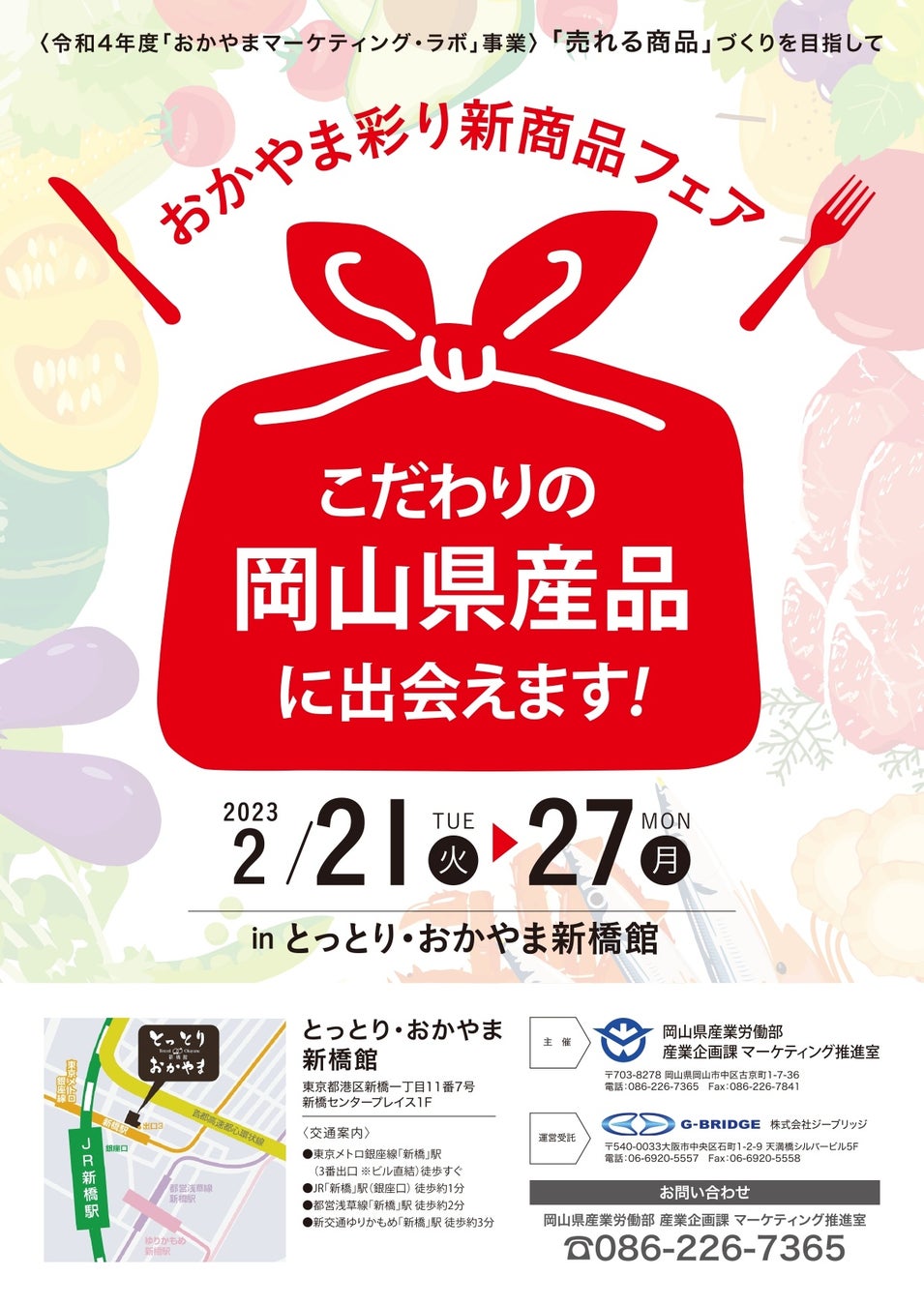 この度、新商品が完成し、これらを一堂に集めた展示・販売会「おかやま彩り新商品フェア」をとっとり・おかやま新橋館において開催しますので、お知らせします。