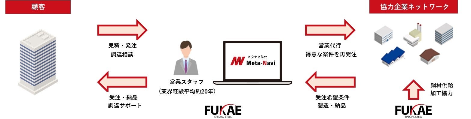 「メタナビNet」では、協力企業の強みに応じた項目(地域、技術、設備、精度、実績等)に基づき、システムで顧客と協力企業をマッチングし、QCD (品質、価格、納期)を総合的に考慮した上で再委託先を決定致します。