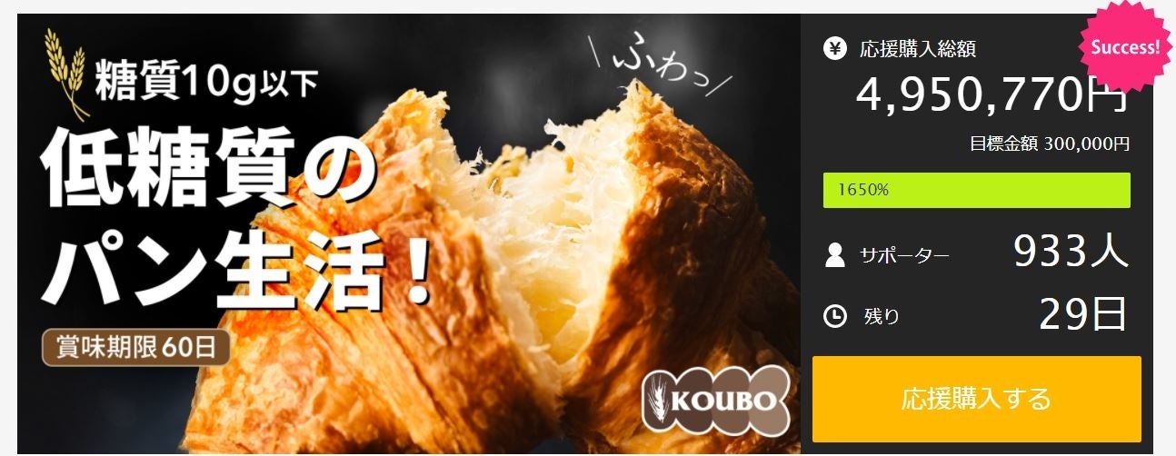 Makuakeパン部門史上最高記録!応援購入金額495万円、サポーター933人、1650%達成!1日29万個売れた伝説の低糖質クロワッサンをリニューアルし、低糖質パンシリーズ『低糖質Style』新発売