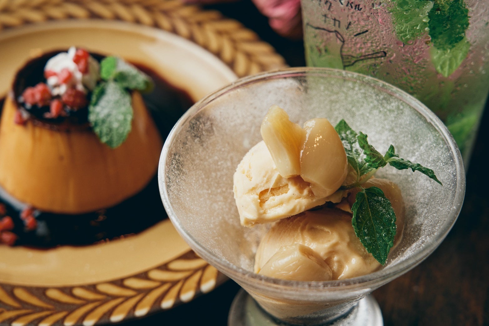 葡萄よりも糖度の高い「福地ホワイト六片」だからこそ作れる特製にんにくデザート。コンポート状に甘く煮詰めた「福地ホワイト6片」は、爽やかなバニラアイスとの相性抜群です。