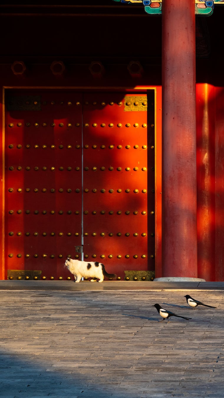 右の写真は、故宮に住む「御猫」が、慶び事の前兆を告げるカササギを従えて、吉方である左方向へ行進する一瞬を捉えた写真です。コロナ禍で困難も多いですが、よい方向へむかっていくようにとの願いを込めて、慶びの詰まった本画像を本展のメインビジュアルとし、チラシ・ポスターにも使用しています。