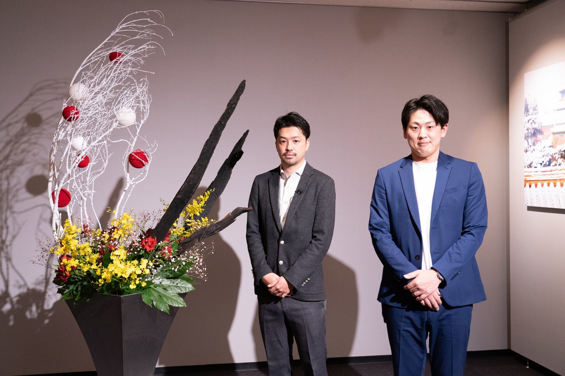 開催初日となる3月1日には華道家元池坊プロデュースによる“IKENOBOYS”(はなをいけるメンズ=イケメン集団)の二人が現場でライブパフォーマンスを行い、紅白の花材を用いた「日中友好のいけばな」をつくりあげました。本作は3月6日(日)まで日中友好会館美術館にてご覧いただけます。