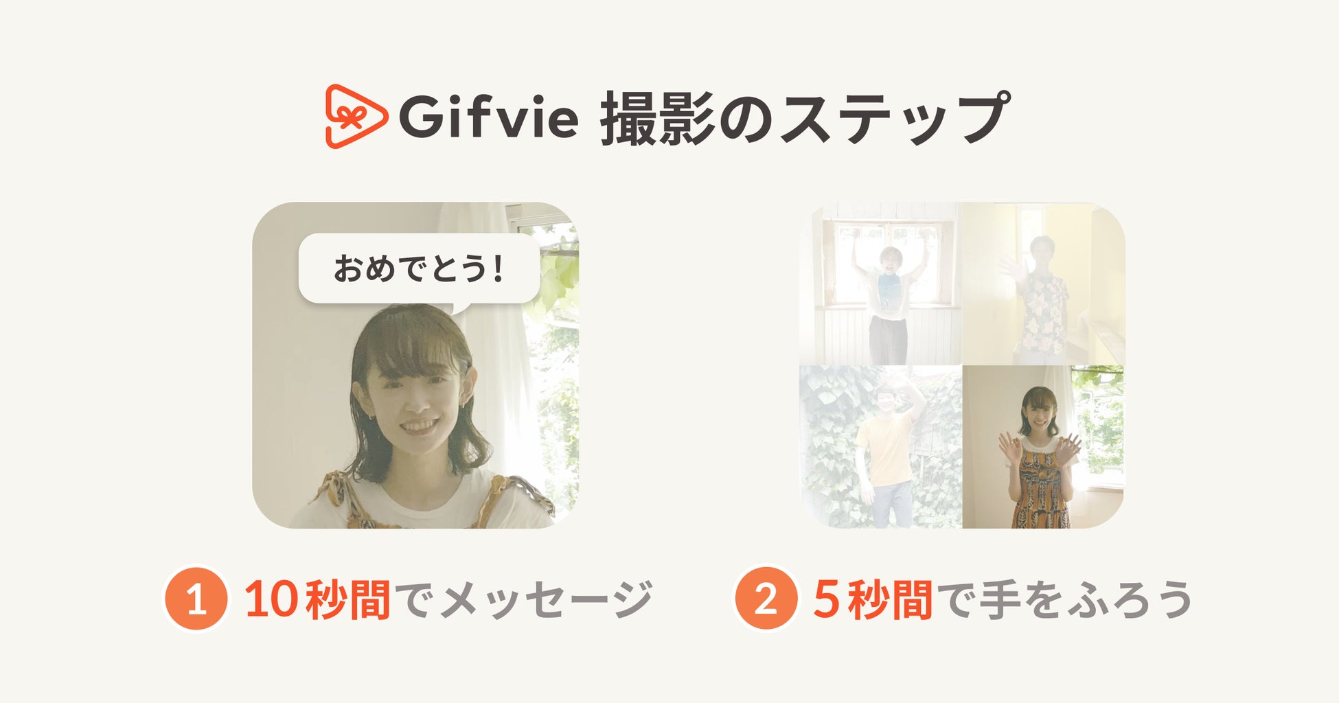 2021年9月にローンチした「Gifvie」(読み:ギフビー)は、メッセージ動画をスマホで自撮りするだけで、複数人でのメッセージムービーを編集いらずで作成できるサービスです。幹事の進行管理や、編集スキル、専用アプリは一切不要。伝えたい想いさえあれば、3ステップで簡単にムービーを作成できます。結婚、出産、誕生日のお祝いや、職場の送別会、卒業式など、幅広いシーンでご利用いただけます。