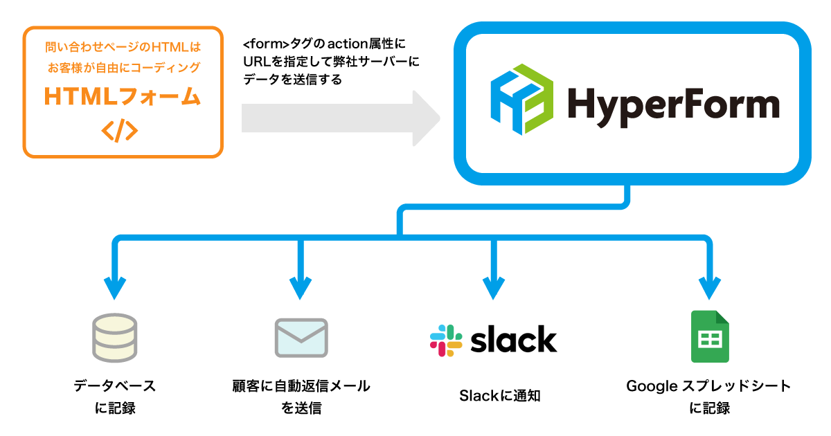 HyperFormより発行されたURLを、<form>タグのaction属性にセットするだけで、フォームからの問い合わせを柔軟に管理することができます。