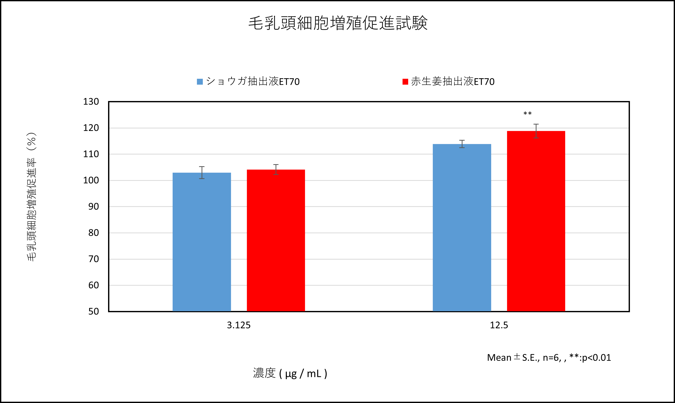 本研究により、赤ショウガエキスはショウガエキスと同等もしくはそれ以上の頭皮や皮膚に対するアンチエイジング作用を有することが示唆されました。さらに毛乳頭細胞を増殖させる効果があることから、頭皮だけでなく育毛効果としても期待がもてると思われます。今後は育毛関連のデータをさらに充実させ、さらなる効果を探索していきます。