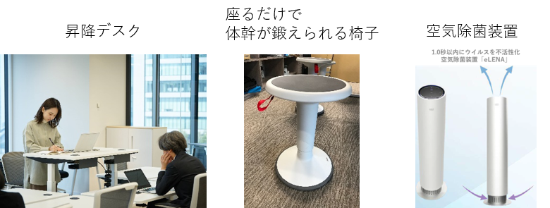 体幹が鍛えられる椅子を設置。また、新型コロナウイルス対策として、新型コロナ不活性化を国内初で確認した強い殺菌能力をもつ紫外線UV-C派空気除菌装置を各会議室に導入し、社員が快適・安全・健康的に仕事ができるよう、職場環境を整備しました。