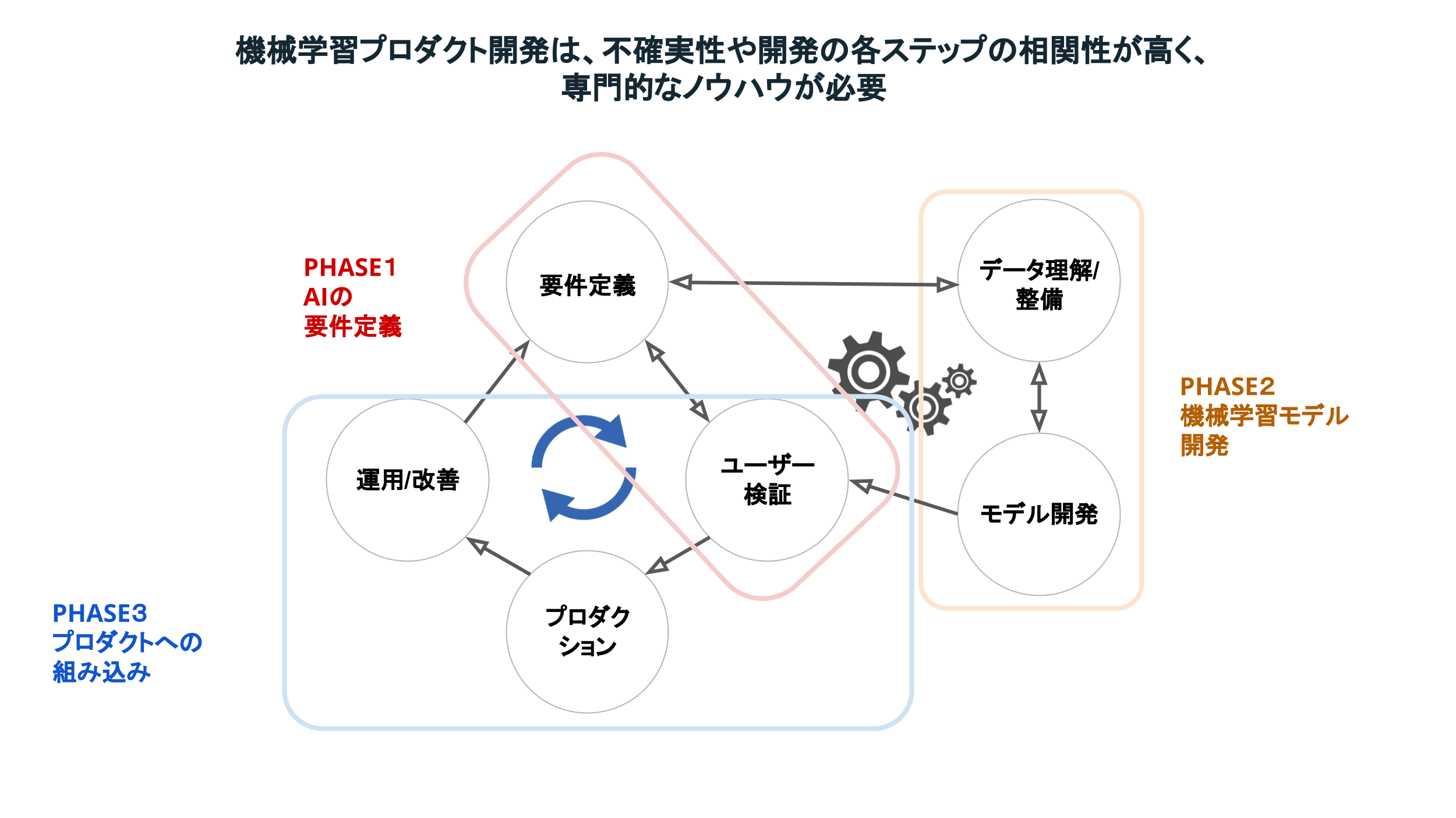 しかし、機械学習プロダクトの開発を成功させるためには、機械学習モデル自体の開発以外にも、AIの特性を考慮したプロダクトの要件定義や、モデルの改善を見越したAIのシステムへの組み込みなど、開発の各フェーズにおいて、データサイエンスの専門的な知見が必要になります。そのため、機械学習のモデル開発はしたものの、その機能がプロダクトの価値向上に十分に結びつかないケースも多いです。