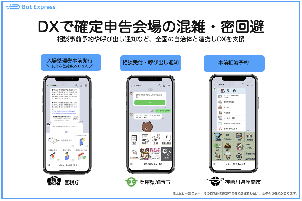 Bot Expressは、兵庫県加西市以外とも確定申告をサポートするLINEを活用した行政サービスとして、220万人以上が友だち登録し入場整理券事前発行や所得税の確定申告に関する情報検索ができるサービスを国税庁と、また神奈川県座間市・大阪府寝屋川市などとは相談の事前予約受付サービスを運用するなど、日本全国の自治体との協働により、行政に特化した機能を開発し行政のDX推進をサポートしています。