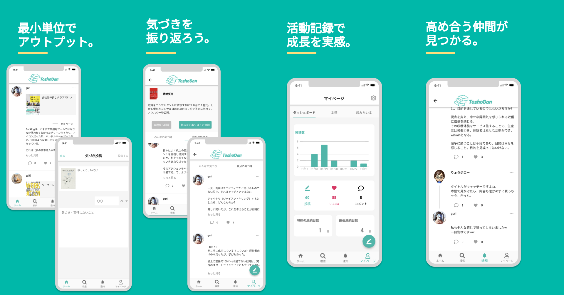ToshoDan(トショダン)は、本から得た気づきを積み重ねる読書メモ×SNSアプリです。