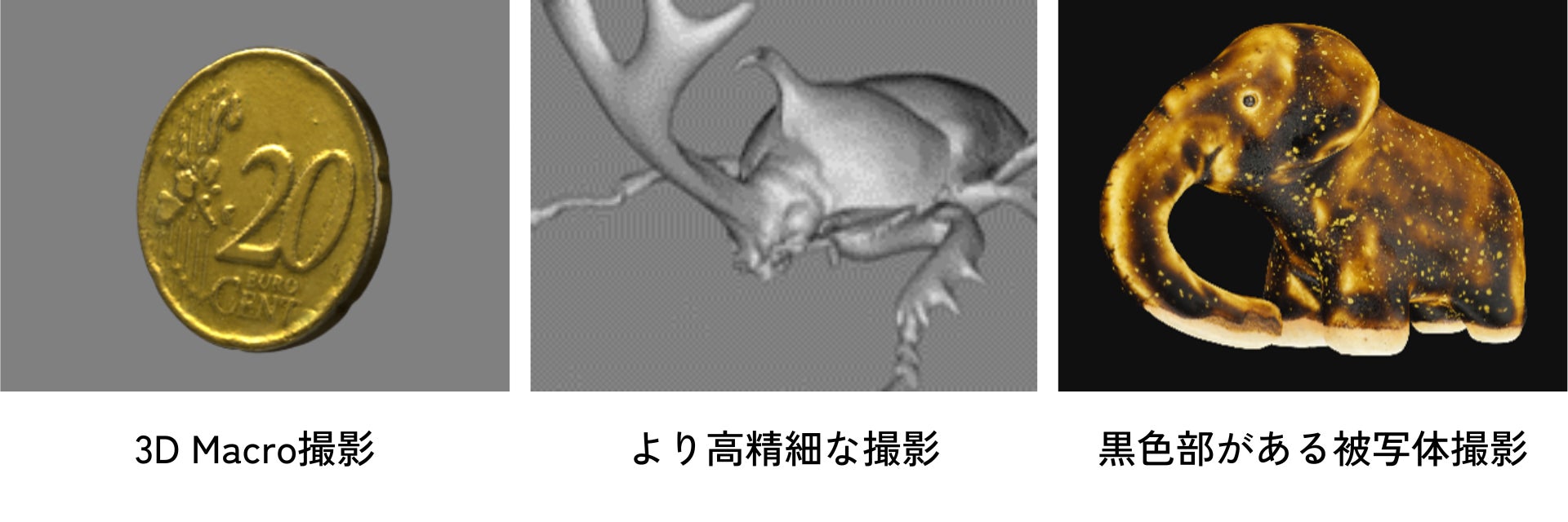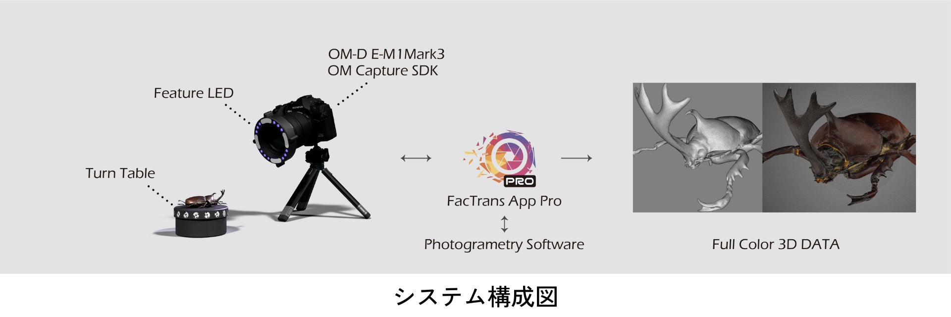 今回発表する「FacTrans Pro / E-M1 III」は、株式会社 Arcana 製作所が開発した黒色や透明、光沢のある反射するワークでも簡便かつ精密にスキャンできる 3D スキャナーソフトウェア「FacTrans App」、独自の照明システム「Feature LED」と OM SYSTEM のミラーレス一眼カメラの組み合わせで実現した、高精細 3D スキャナーシステムです。撮影からデータ生成に係る工程をワンクリックで実行可能な「FacTrans App」で簡便性を追求するとともに、OM SYSTEM のミラーレス一眼カメラによる高解像画像の取得によってモデリングの高精細化や再現性の高いテクスチャ生成を実現します。さらに OM SYSTEM のミラーレス一眼カメラで得られる深い被写界深度は、ハイレゾショットや深度合成機能を活用することにより、3D スキャナー撮影の可能性をさらに広げます。