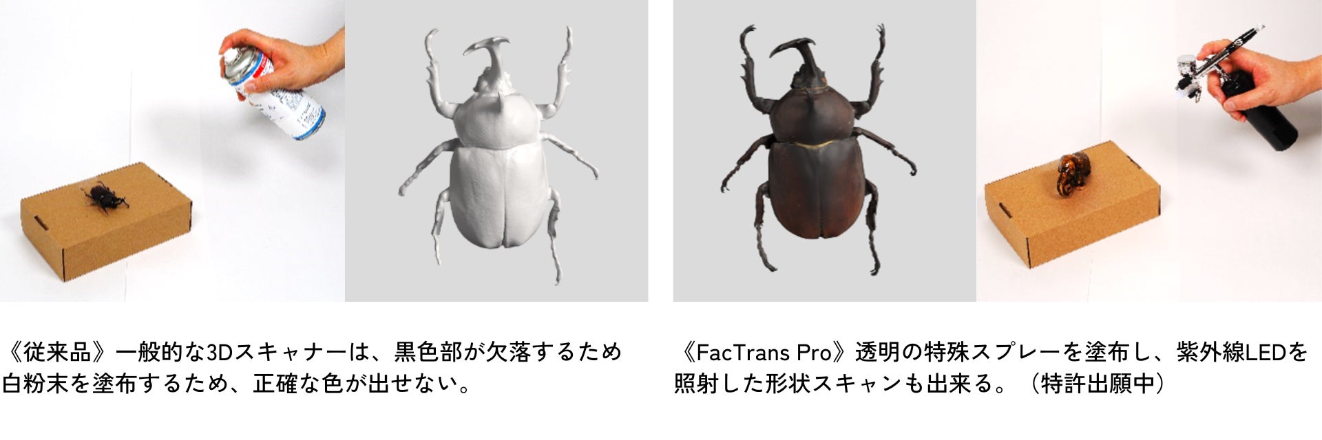一般的なスキャナーで黒色部や透明体、光沢面をスキャンするには、白い粉体を塗布する必要がありましたが、ワークが白色となり、正しい色情報を取得することができません。本システムでは紫外線で発光する特殊インク「Feature Spray」を使用し、紫外線 LED と白色 LED を切り替えながらスキャンすることで正確な色情報の取得が可能となります。OM SYSTEM のミラーレス一眼カメラによる高解像画像と深い被写界深度により、優れたテクスチャ再現性を発揮します。