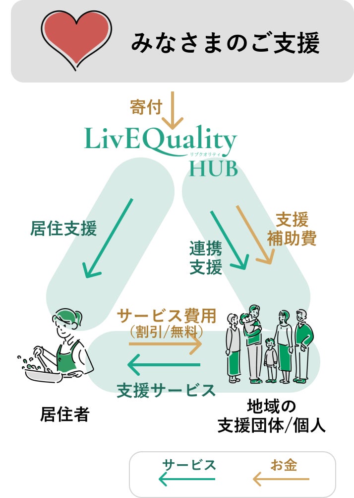 ※1…千年建設は2021年より先行して本事業を開始しており、2022年2月現在43室(名古屋市内)をLivEQualityブランドの自社物件として所有。うち4室の入居者に対し、期間限定の家賃減額や初期費用の分割払い等による支援を行っている。LivEQuality HUBおよび地元の支援団体とともに、行政手続きの支援、就労相談、日本語教育支援(外国人世帯)、見守り支援などを提供している。