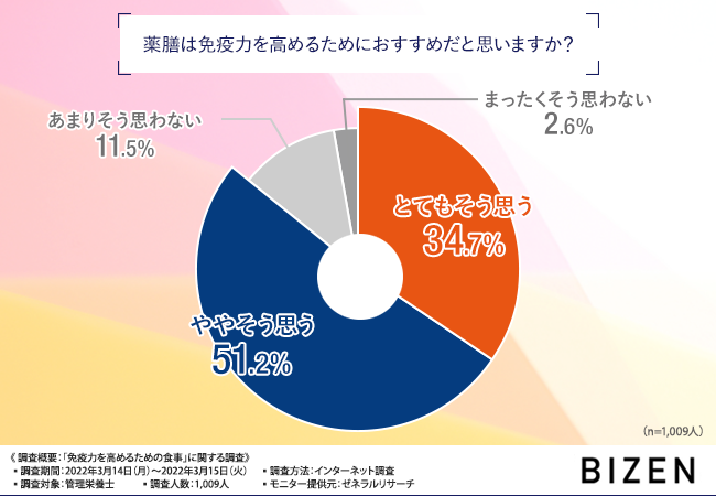 そこで、「薬膳は免疫力を高めるためにおすすめだと思いますか?」と質問したところ、8割以上の方が『とてもそう思う(34.7%)』『ややそう思う(51.2%)』と回答しました。