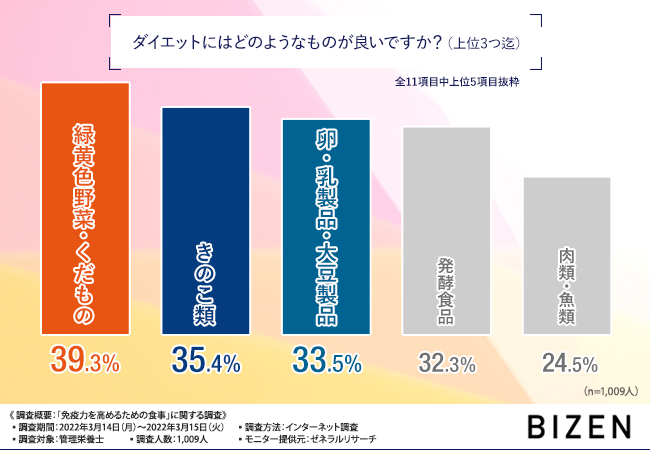そこで、「ダイエットにはどのようなものが良いですか?(上位3つ迄)」と質問したところ、『緑黄色野菜・くだもの(39.3%)』と回答した方が最も多く、次いで『きのこ類(35.4%)』『卵・乳製品・大豆製品(33.5%)』と続きました。
