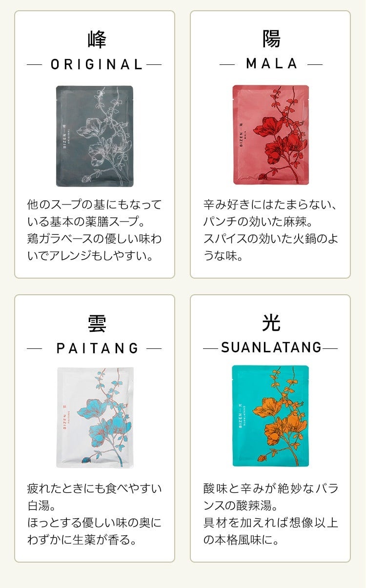 『BIZEN(美善)』には「峰 ORIGINAL」「陽 MALA」「雲 PAITANG」「光 SUANLATANG」の4種類の味があり、4種類の味×2食ずつの8食セットで販売します。