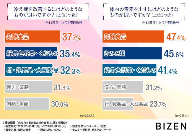 「体内の毒素を出すにはどのようなものが良いですか?(上位3つ迄)」と質問したところ、『発酵食品(47.4%)』と回答した方が最も多く、次いで『きのこ類(45.6%)』『緑黄色野菜・くだもの(41.4%)』と続きました。