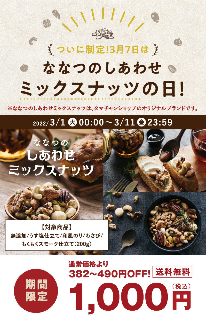 3月7日は「ななつのしあわせミックスナッツの日」に制定!ミックスナッツの魅力をタマチャンショップから発信!