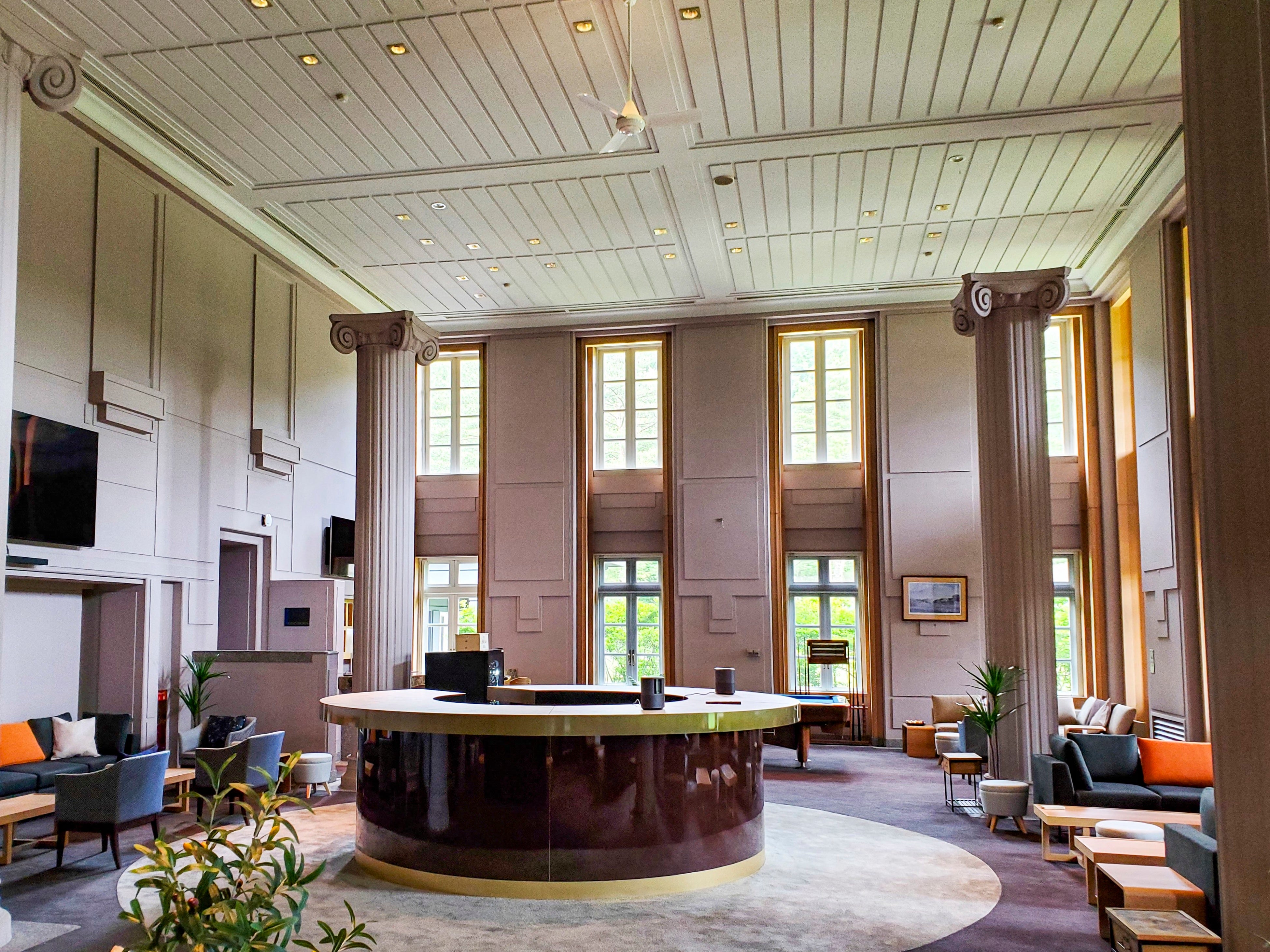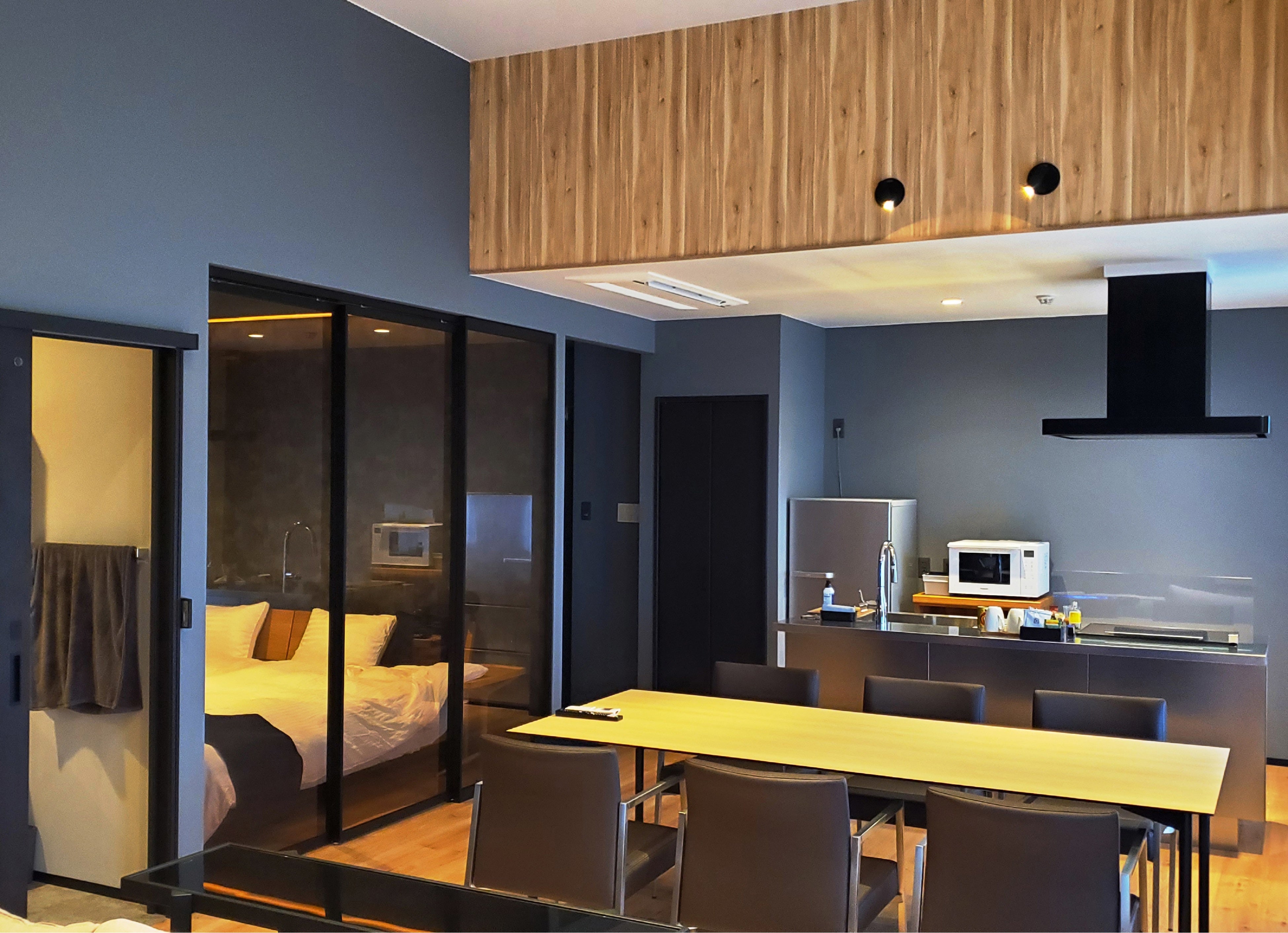 ゴルフ場に併設されたレジデンスホテルは、都心のマンションとは異なり、軽井沢のリゾート施設らしいデザインと間取りを採用しています。最低客室面積50㎡以上天井高は3.6m~5mの大空間で、それぞれにアイランドキッチンをはじめ、長期滞在にも対応する環境が整います。調理器具、食器、家電製品、洗濯乾燥機が揃い、ウィルス対策用の空気清浄機エアドッグも設置されています。