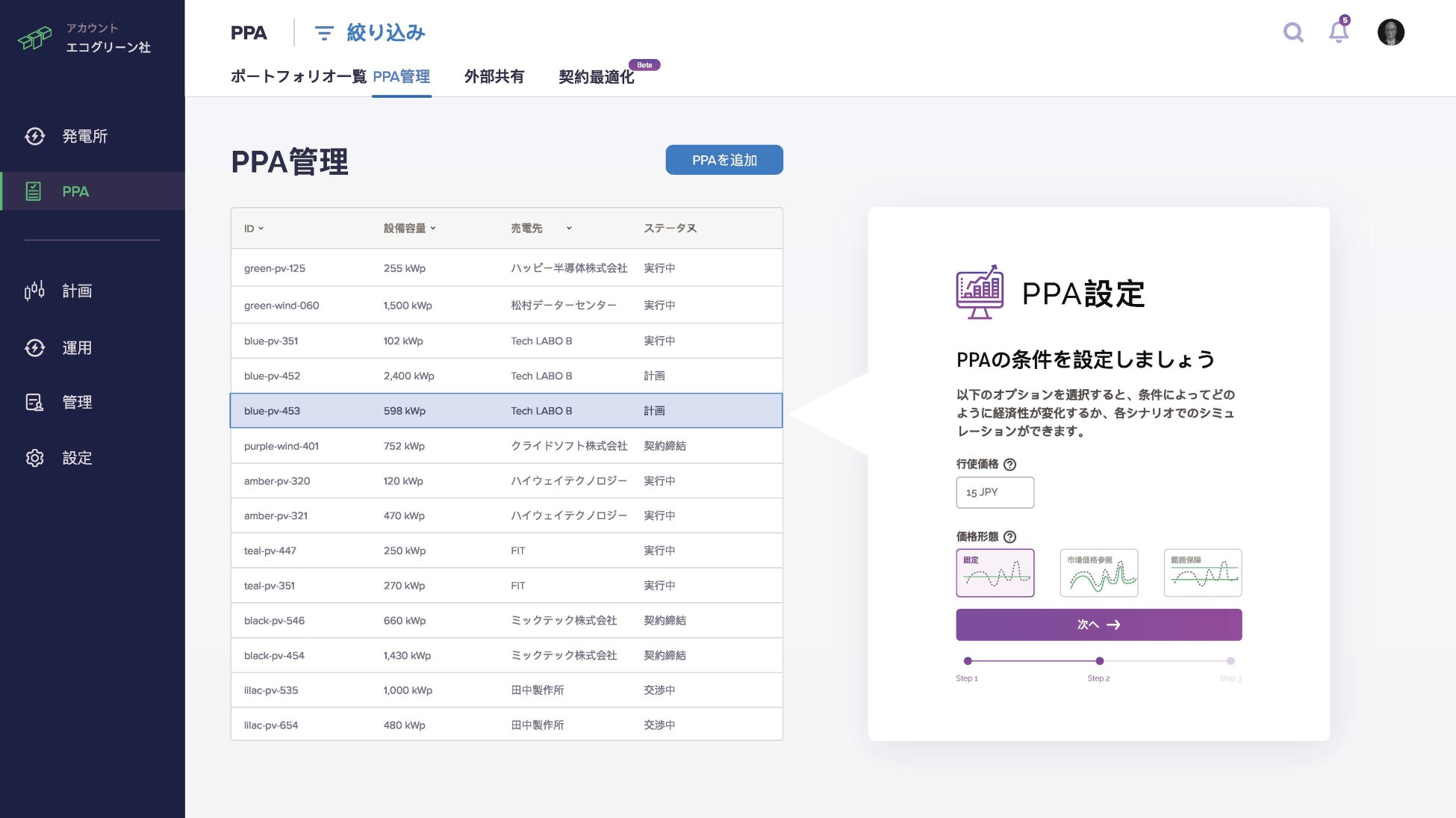 Tensor Energyは、第一弾として、2022年春、再エネ開発業者と再エネ発電事業者向けに、FIT(注1)、FIP(注2)その他の相対契約に対応したアセットデータ管理システム、そして、経済性と環境価値のシミュレーションによってFIPやPPAの意思決定をサポートする、Tensorプラットフォームのプロトタイプ版を限定リリースします。インターフェースは再エネ開発業者、発電事業者、投資家、需要家向けにそれぞれ最適化され、各ステークホルダー間の情報共有業務を省力化します。β版公開リリースは2022年末を予定しております。