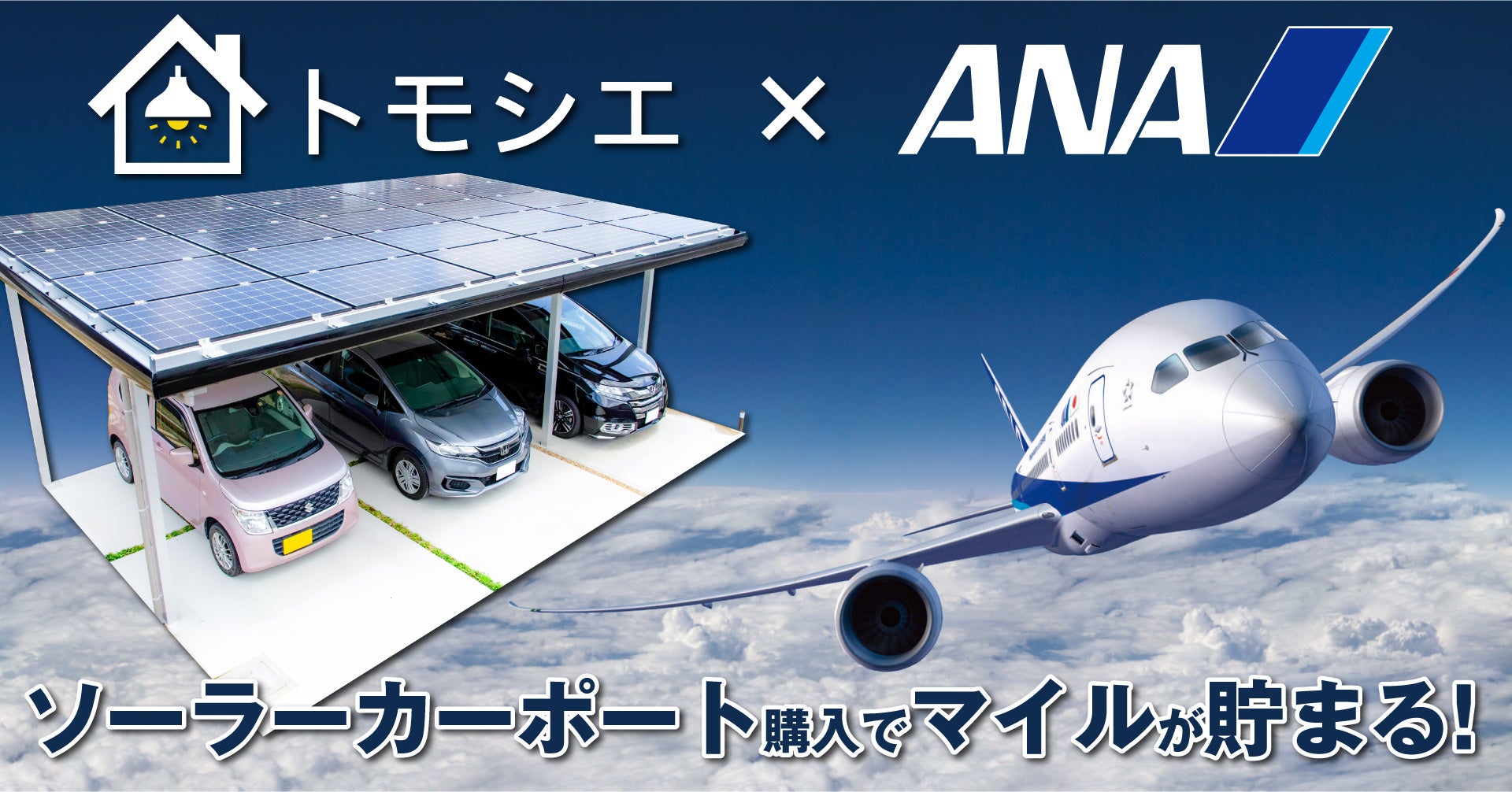 この度、再生可能エネルギーで自宅を灯していただけるお客様をさらに増やすべく、航空事業を中核とするエアライングループとして様々な環境負荷軽減活動を行っているANAと、ANAのマイルを連携いたします。この連携により、 新たにトモシエのソーラーカーポートを購入いただいた方に対し、購入金額200円(税込)につき1マイルが積算されるようになりました。