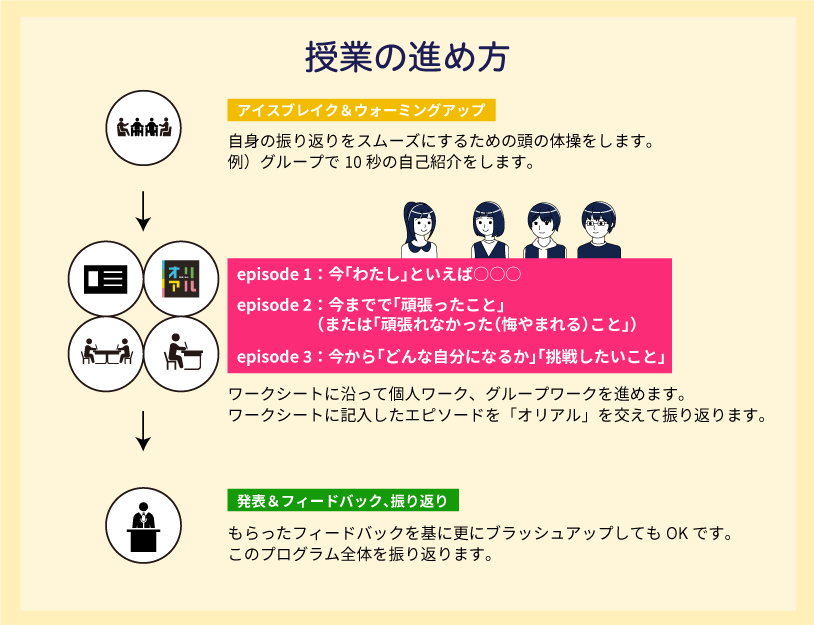 また、エピソードを写真を使いアルバムを作るようにまとめていくことで客観的に自身の経験を捉え直し、自己理解を深めていきます。