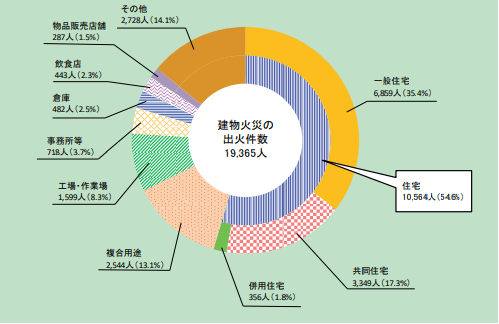 総務省消防庁の発表※によると、令和2年中の出火件数は3万4,691件。1日あたりでみると95件の火災が発生していることになります。この出火件数のうち建物火災が最も高い比率を占めており、その中でも住宅火災が1万564件と最も高く、建物火災全体の54.6%を占めています。出火原因は、こんろの消し忘れ、たばこの不始末、電気機器に起因するものが多くなっています。