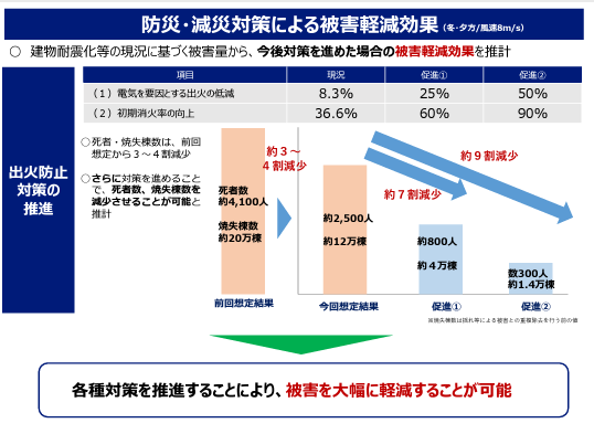 一部抜粋すると、前回想定より死者・焼失棟数は3~4割減少するものの、現在の初期消火率では死者数約2,500人、焼失棟数は約12万棟となっています。この対策として、(1)電気を要因とする出火の低減(2)初期消火率の向上を進めることで死者数・焼失棟数を減少させることが可能と推計されています。
