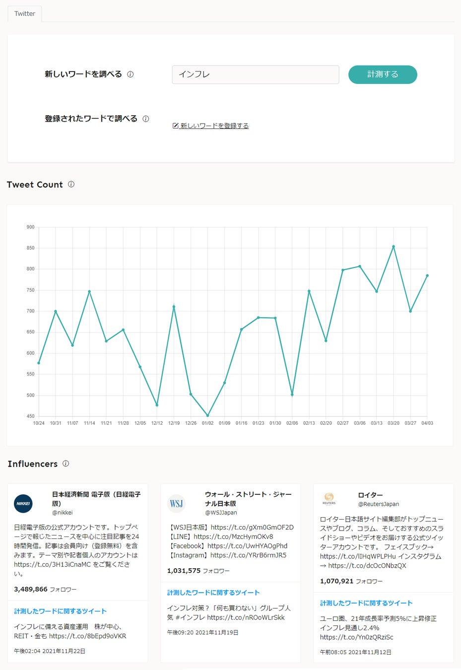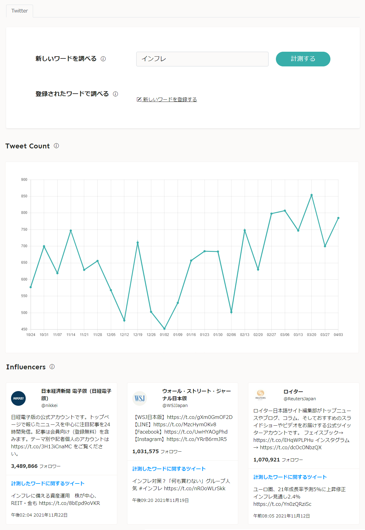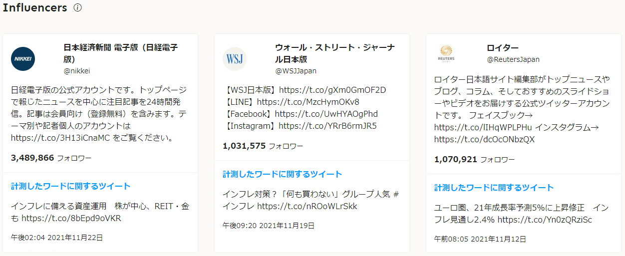 また、当該キーワードにおけるインフルエンサーをピックアップし、一覧表示します。