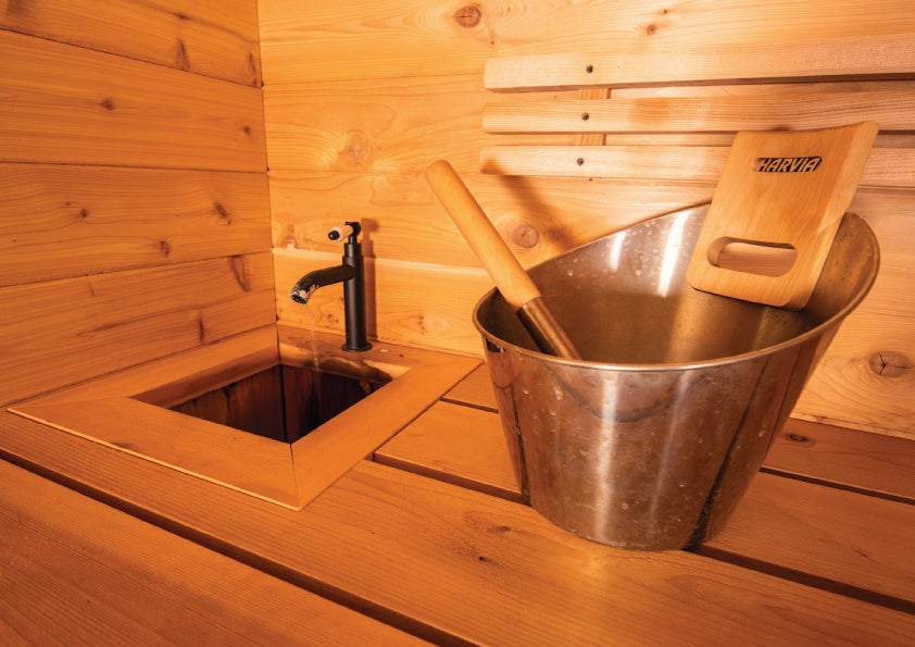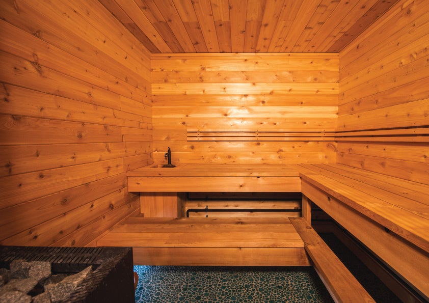 サウナの内装には、⽊肌が柔らかく、耐久性にも優れたウェスタンレッドシダーを使用しています。また、ウェスタンレッドシダーは⽊の⾹りが特徴で、サウナ室内は香りからもリラックスできる空間となっております。外壁にも、ウェスタンレッドシダー(シダーシェイク)を使⽤して森と⼀体感のあるデザインになっています。構造は、サウナ室内までに⾵除室を通る⼆重構造にすることで室内の温度が保たれるデザイン性・機能性を持ったつくりになっております。