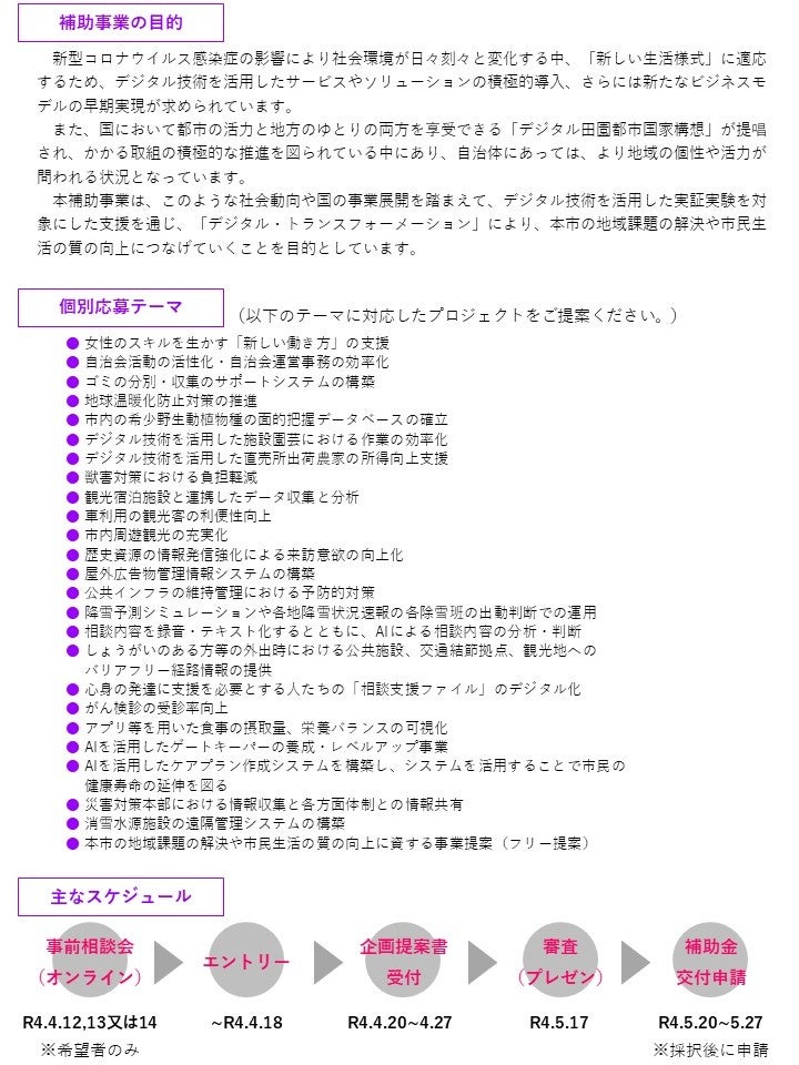本補助事業は、このような社会動向や国の事業展開を踏まえて、デジタル技術を活用した実証実験を対象にした支援を通じ、「DX」により、本市の地域課題の解決や市民生活の質の向上につなげていくことを目的とします。