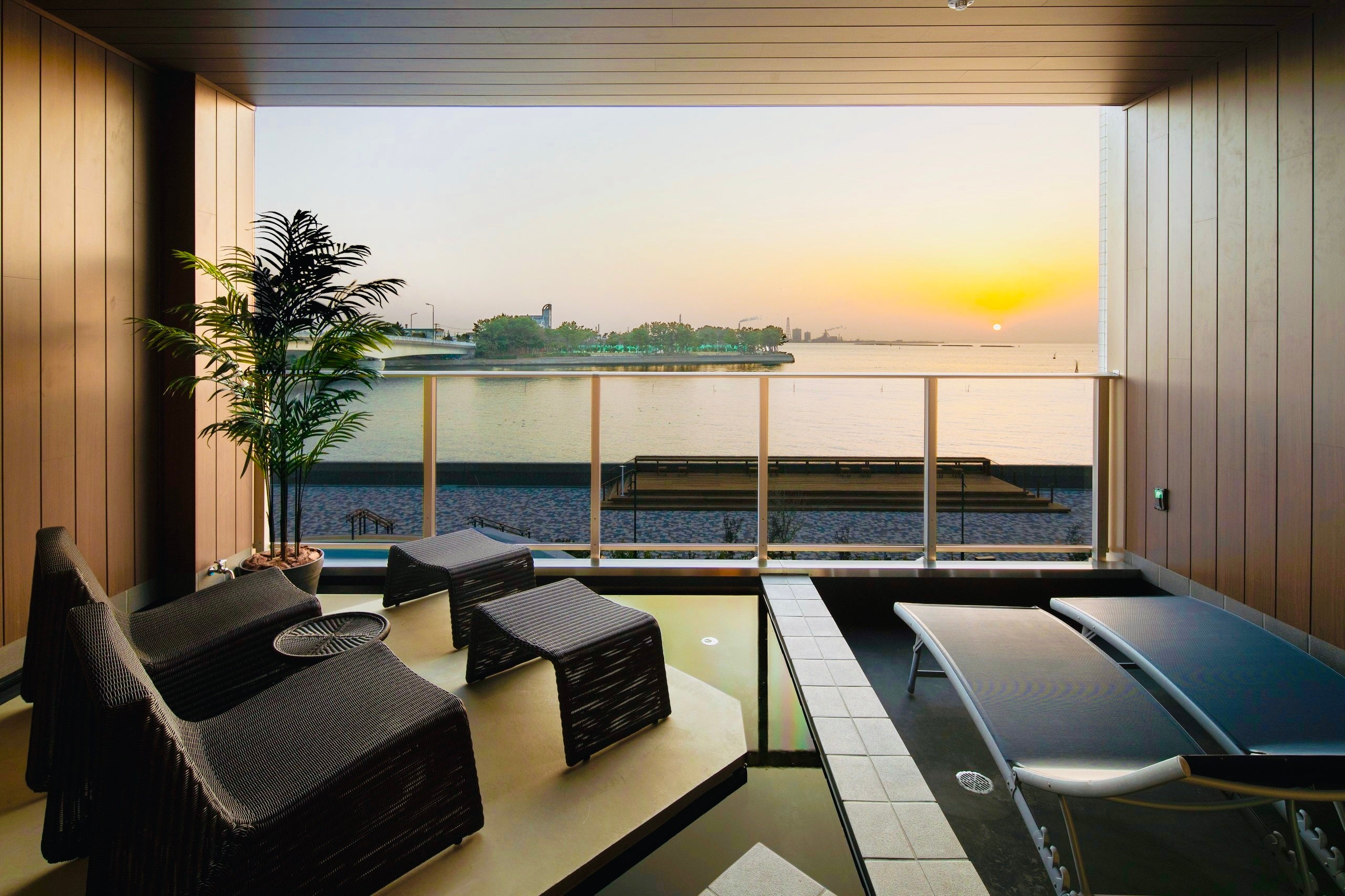 全ての客室に引湯した本格的な温泉を配置。東京湾を眺めながら温泉をお楽しみいただけます。硫黄成分を多く含むお湯は、入るだけでサラサラすべすべに。お食事を楽しんだ後には、客室であったかい温泉にゆっくりと浸かり、日々の疲れをゆっくりと癒していただけます。