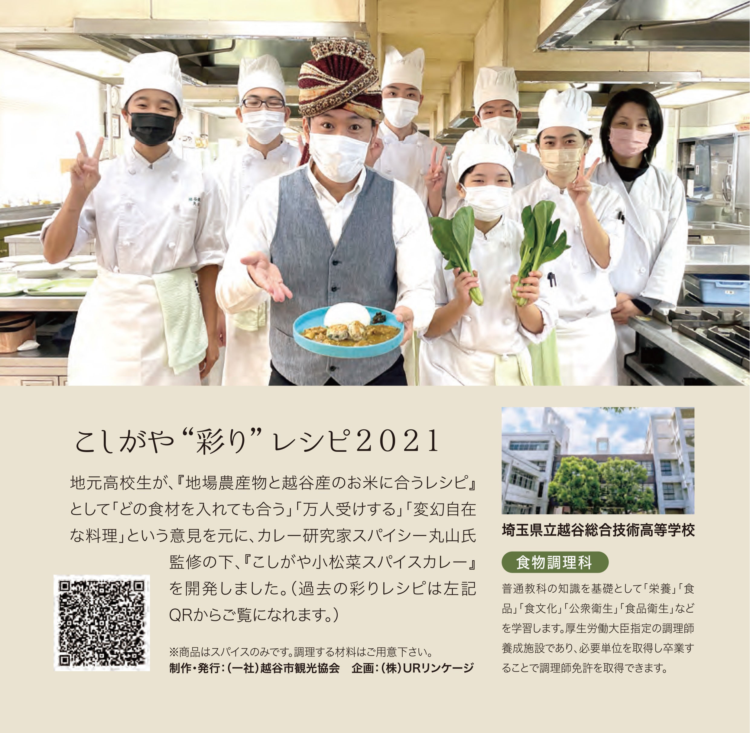 今年度は、埼玉県立越谷総合技術高等学校食物調理科の生徒が、『地場農産物と越谷産のお米に合うレシピ』として「どの食材を入れても合う」「万人受けする」「変幻自在な料理」という意見を基に、カレーのスペシャリスト「カレー研究家スパイシー丸山」監修の下、『こしがや小松菜スパイスカレー』のレシピを完成させました。