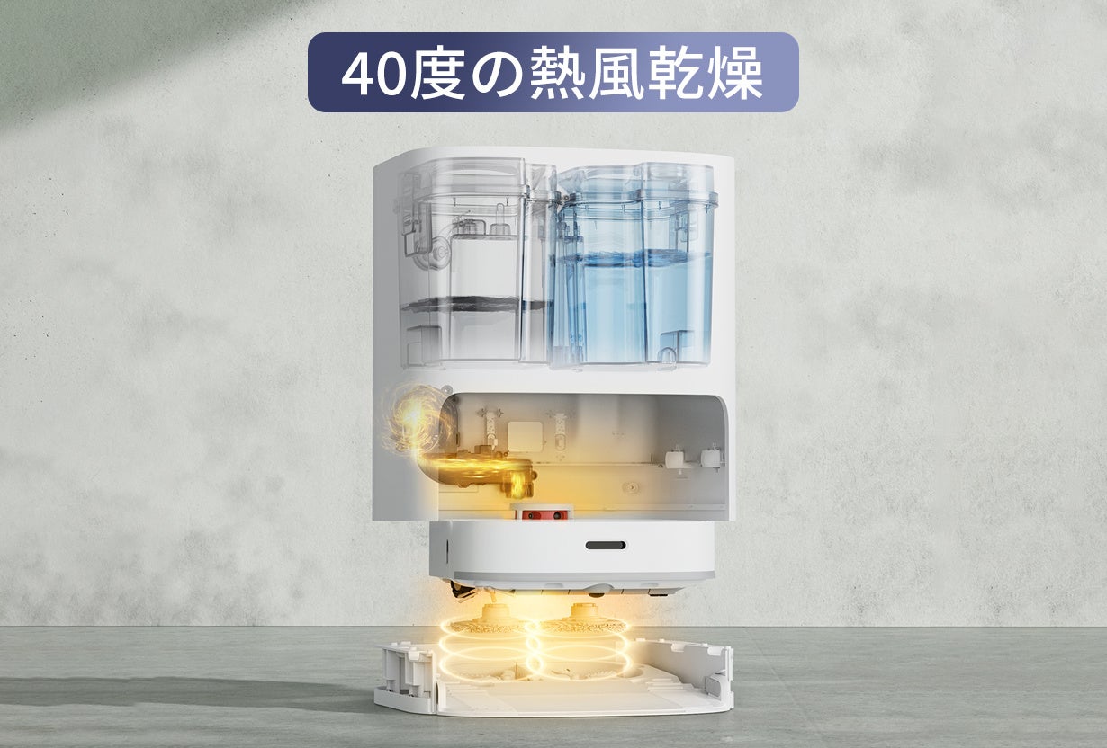 一般的な水拭きロボット掃除機のモップ乾燥は自然乾燥もしくは送風乾燥ですが、Dreame Bot W10は40度の熱風乾燥を採用し、2時間でモップを素早く乾かします。