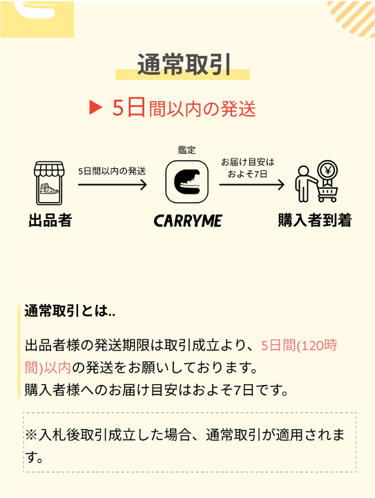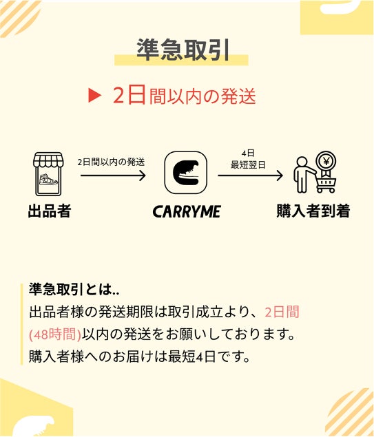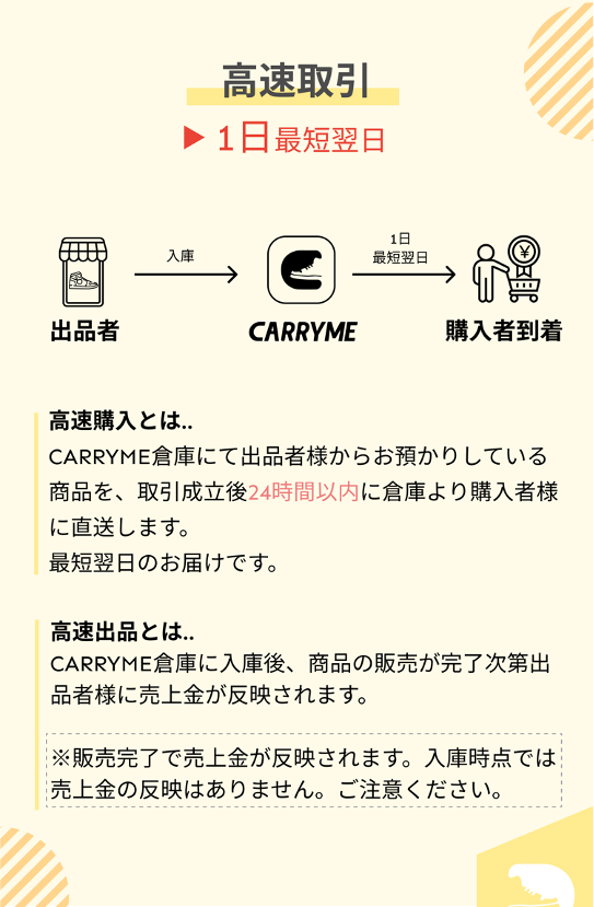 CARRYME倉庫にて出品者様からお預かりしている商品を、取引成立後24時間以内に倉庫より購入者様に直送します。