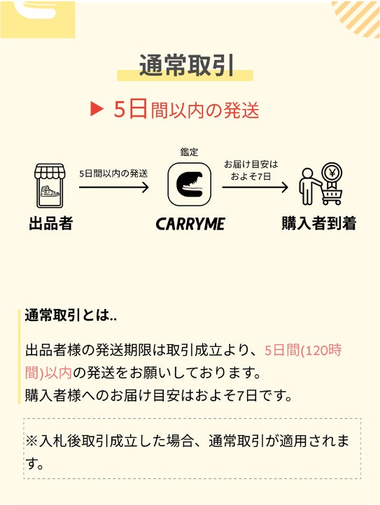 出品者様の発送期限は取引成立より、5日間(120時間)以内にお願いしています。