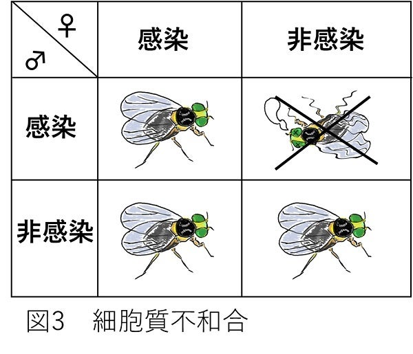 マメハモグリバエは世界的な農業害虫であり、様々な化学農薬が使われています。しかし、農薬の安全性、生態系への影響や害虫が農薬に抵抗性を持つなど多くの問題が指摘されています。多くの昆虫には細胞内に微生物が感染していることが知られており、特にボルバキアはほぼ半数の昆虫種に感染しているといわれています。マメハモグリバエはボルバキアに感染しており、ボルバキアに感染したオスのマメハモグリバエと感染していないメスのマメハモグリバエが交配すると子供ができにくくなります(細胞質不和合:図3)。