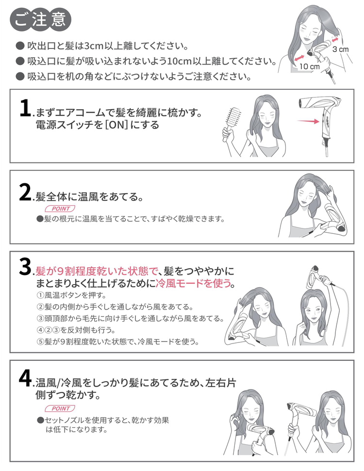 電源スイッチを「ON」にする。2. 髪全体に温風をあてる。