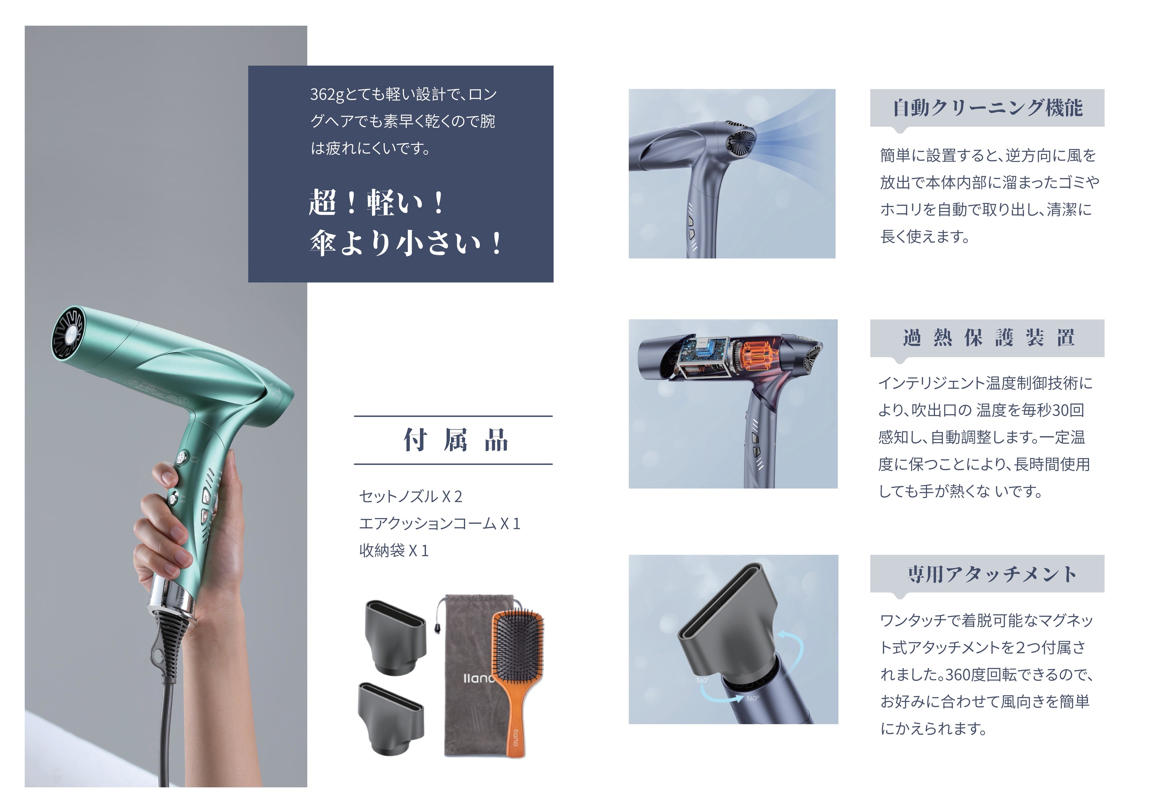 llano独自開発のデュアル送風回路を設計し、低騒音化技術を取り込んだ13枚羽根構造並びに直流風道を加えて、夜中でも気にせず使えそうです。従来のドライヤーは、急激な温度の上昇や不安定な風温により髪へダメージを与えてしまっていました。温度センサーにより毎秒50回髪の風温を感知し、インテリジェント機能がドライヤーの温度と風量を自動調整し、過度な熱から髪を守ります。キューティクルを引き締め、ヘアカラーの退色を抑制し、艶やかで美しい髪へと導きます。