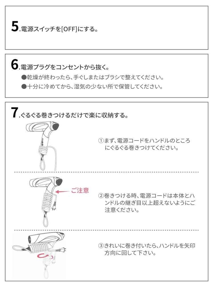 ②巻きつける時、電源コードは本体とハンドルの継ぎ目以上超えないようにご注意ください。