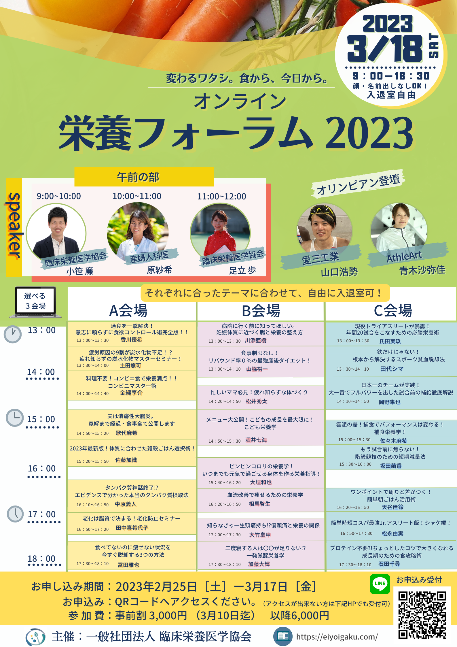 生化学および生理学に基づく正しい栄養学の知識の普及を目的として活動している一般社団法人臨床栄養医学協会(所在地:北海道札幌市)が、2023年3月18日(土)の9時から18時までの9時間で、栄養学に関する栄養フォーラム全28講座を開く。
