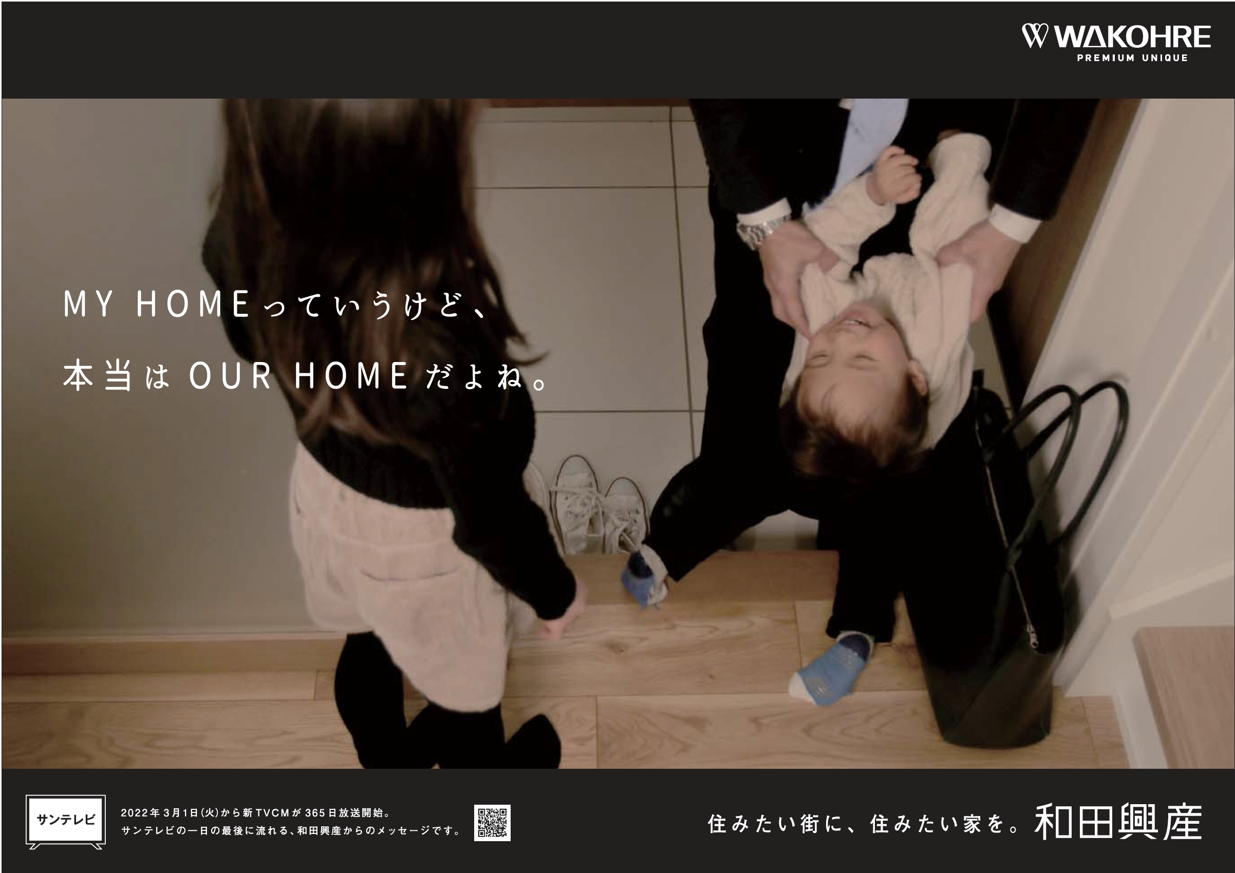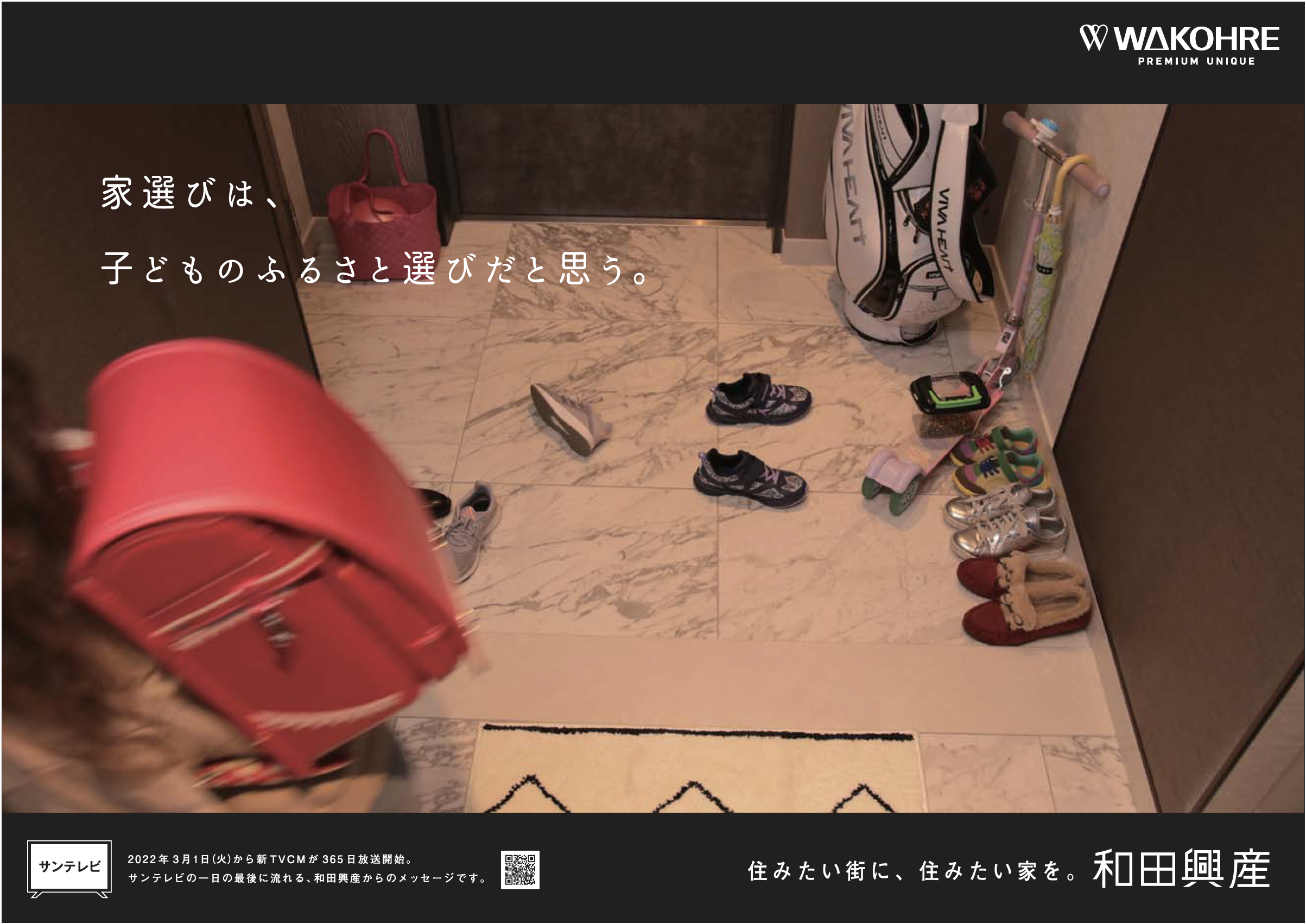 兵庫県・大阪府内で高級分譲マンション「ワコーレ」シリーズを展開する和田興産株式会社(所在地:兵庫県神戸市)は、長尺60秒のTVCM「家族の足元」篇を2022年3月1日(火)より、兵庫県・大阪府などで365日毎日、サンテレビの番組終了の時間直前に放映いたします。