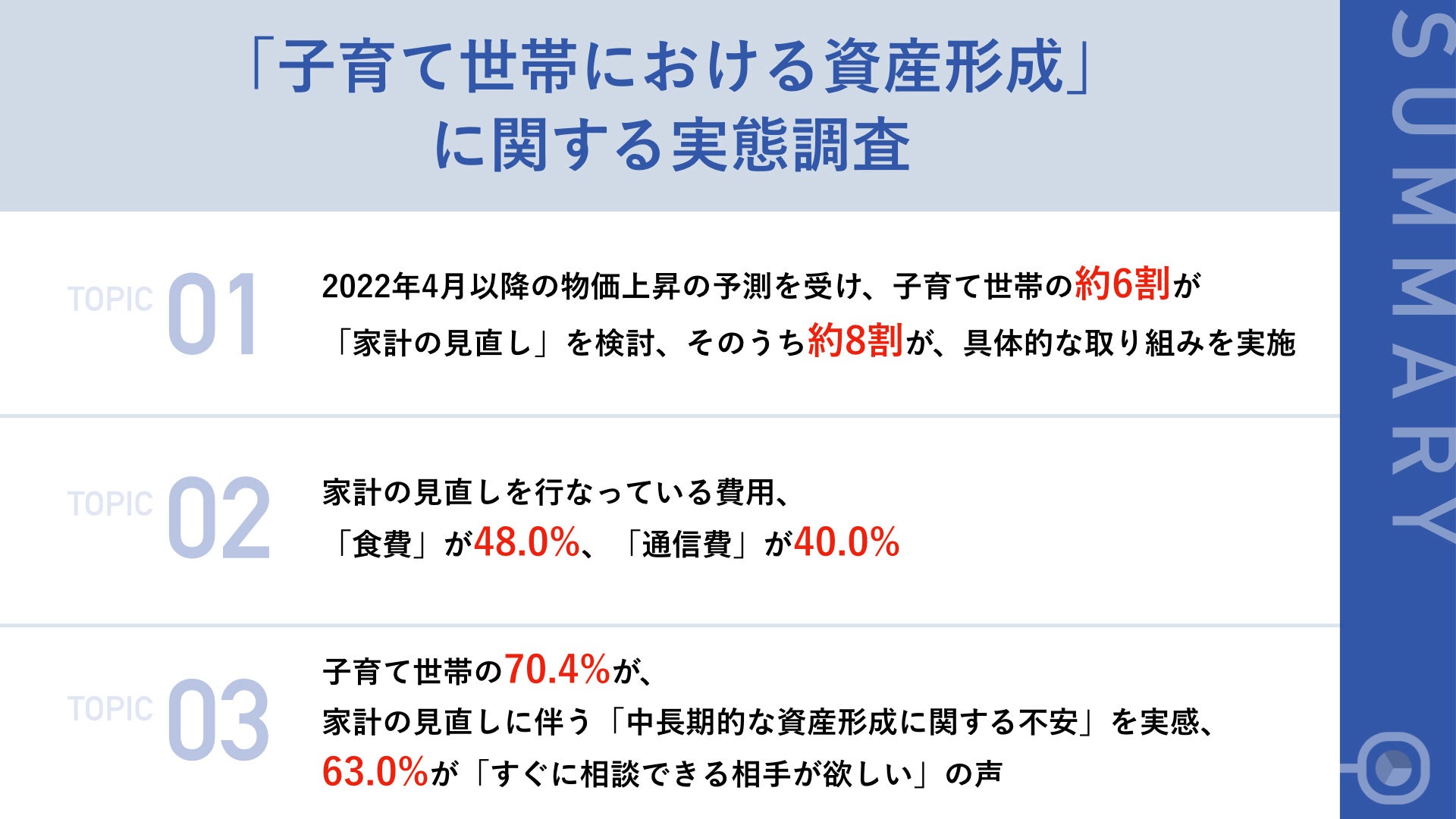 今回の調査では、2022年4月以降の更なる物価上昇の予測を受け、多くの子育て世帯に不安が広がっていることが明らかになりました。これらの背景から、「家計の見直し」に取り組む家庭が多い一方で、現状の「家計の見直し」では、中長期的な資産形成には不安が残ると感じる人も多いようです。コロナ禍による経済の圧迫で収入は増えず、子どもの学費や自身の老後に備えられる自信がないという声や、資産を持っても資産価値が下がるのではないかという危機感は、高まる一方です。そのような危機感を払拭するためにも、将来に備える資産形成について、何か起きた場合にすぐに相談ができる専門家を今から見つけておくことが重要なのではないでしょうか。