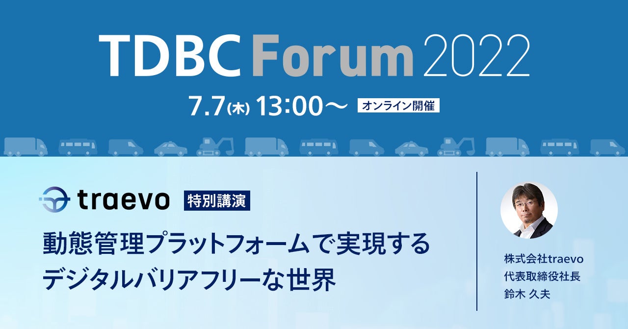 株式会社traevo(東京都港区、代表取締役社長 鈴木 久夫、以下 traevo)は、運輸業界の社会変革を推進する一般社団法人運輸デジタルビジネス協議会(東京都港区、代表理事 小島 薫、以下 TDBC)が、7/7(木)に主催する無料オンラインイベント「TDBC Forum 2022」に参加し、特別講演「動態管理プラットフォームで実現するデジタルバリアフリーな世界」に登壇します。