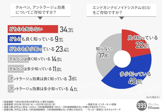 そこで、「エンドカンナビノイドシステム(ECS)をご存知ですか?」と質問したところ、『良く知っている(22.2%)』『多少知っている(40.0%)』『知らない(37.8%)』という結果になりました。