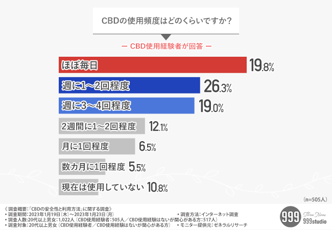 そこで今回、『Natural CBD 999』(https://x.gd/Vxvgc)を販売するブランド999studioを運営する株式会社バリューマーケティング研究所は、20代以上男女 (CBD使用経験者/CBD使用経験はないが関心がある方)を対象に「CBDの安全性と利用方法」に関する調査を実施いたしました。